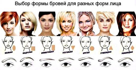 Прямоугольному лицу нужны такие брови, которые смогут сделать его более широким. Именно по этой причине лучше всего подходят прямые брови – их четкие линии мягко округлят ваш образ. А дугообразная форма запрещена, иначе лицо визуально удлинится. Ромбовидное лицо нуждается в смягчении имеющихся у него контуров. Чтобы зрительно уменьшить ширину собственных скул, сделайте классические бровки с легким, красивым изгибом. От прямой, а также слишком изогнутой формы настоятельно рекомендуется отказаться. Преобразить лицо в форме сердца и скрыть его заостренный подбородок удастся за счет дугообразных бровей, при условии, что начало и конец каждой дуги должны находиться на одинаковом уровне. А вот контуры следует сделать такими, чтобы они мягко выделялись. Не обязательно делать высокую дугу, низкая тоже допустима, однако у нее обязательно должны быть смягченные углы – это удлинит образ. На лице в форме треугольника следует создать линию брови с мягкими изгибом. Будьте аккуратны с заостренными углами, которых быть не должно – они сделают ваше лицо еще более угловатым. Не подойдет и вариант коротких бровей, а брови с прямыми дугами сделают лицо грустным. Решительному квадрату никогда не стоит подбирать тонкие брови. Рекомендованы густые брови, поскольку они сбалансируют челюсть и форму. Проблема редких дуг легко решается такими косметическими средствами, как тени, карандаш. Преобразить и наделить квадратный лик более женственным видом позволяют и брови дугообразной формы, только без углов излома. Женщинам с овальным типом лица отлично подходят горизонтальные брови, если излом не слишком сильно поднят. Чтобы зрительно чуть-чуть вытянут лицо, добавить ему немного женственности, бровям понадобится легкое закругление. Овальному лицу можно подобрать и другие брови, кроме прямых и широких – они сделают ваш образ жестким и суровым