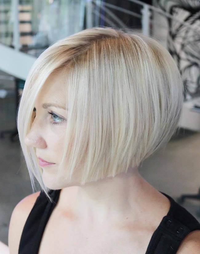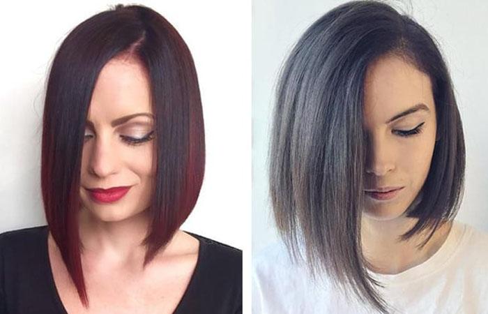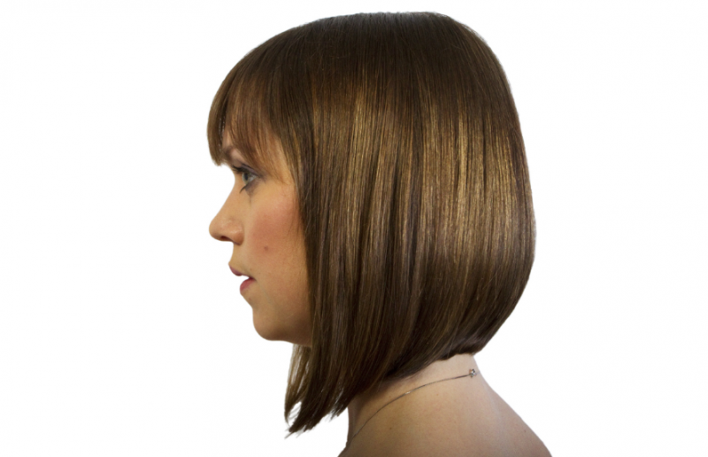 Если угол прически острый, волосы сзади следует остричь. При этом длина передних прядей может варьироваться и доходить до ключиц.