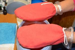 Для этой процедуры нужен натуральный пчелиный воск или косметический парафин. Если нет специального нагревателя, вполне можно разогреть состав в микроволновой печи или на водяной бане. Как только средство станет жидким, в него нужно окунуть кончики пальцев, затем извлечь, подождать, пока образуются «колпачки» и поверх них надеть косметические перчатки. В идеале манипуляция делается вечером, а снимать воск или парафин с рук нужно уже утром. Если подобное объективно невозможно, постарайтесь продержать «колпачки» хотя бы пару часов. Когда они будут сняты с пальцев, кожу понадобится смазать кремом.