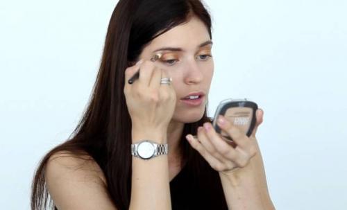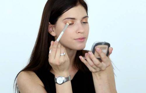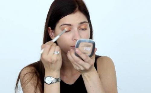 Нанесите сухие тени светлого золотистого цвета на середину подвижного века