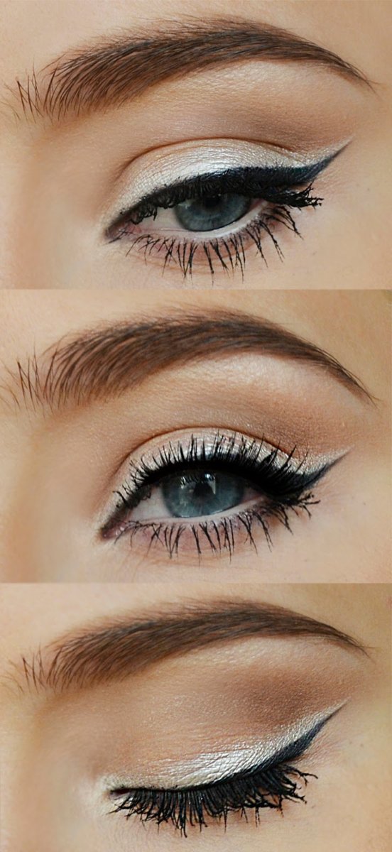 Возле внешнего уголка глаз интенсивность нанесения подводки можно увеличить. Также для ежедневного мейка годится подводка серебристой расцветки, прекрасно подчеркнет необычный цвет глаз.