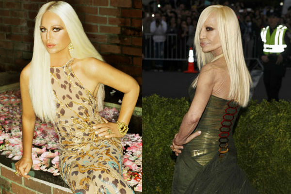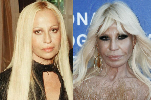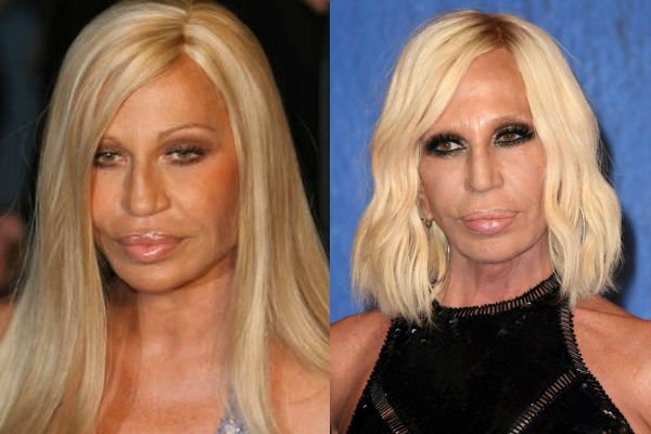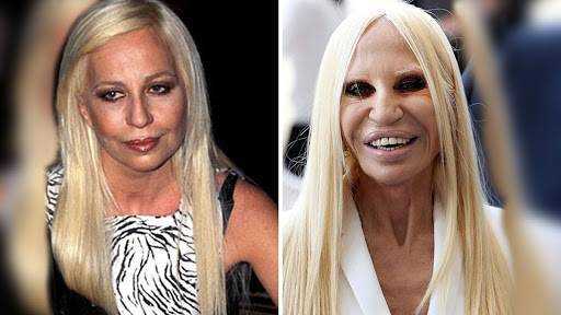 Начиная с 1990-х годов, Донателла Версаче начала буквально купаться в роскоши. Летая на собственном самолете и останавливаясь только в самых дорогих номерах люкс, итальянская кутюрье наслаждалась жизнью, в которой стал присутствовать и кокаин. Ввиду этого, симпатичное на вид лицо Донателлы начало быстро стареть и Версаче обратилась к пластическим хирургам. Многочисленные операции дали только временный эффект, а после превратили лицо уже стареющей Донателлы в гротескную маску с неестественно полными губами.