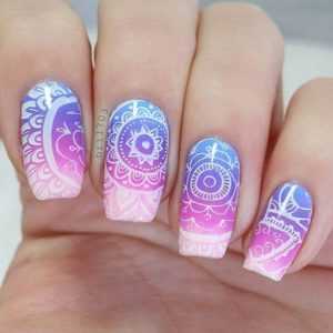Трафареты на ногти помогут выполнить даже сложные вензеля, при минимальных навыках в художественном деле. Очень необычно смотрятся узоры и орнаменты, декорированные сверху блестящим лаком близкой тональности.