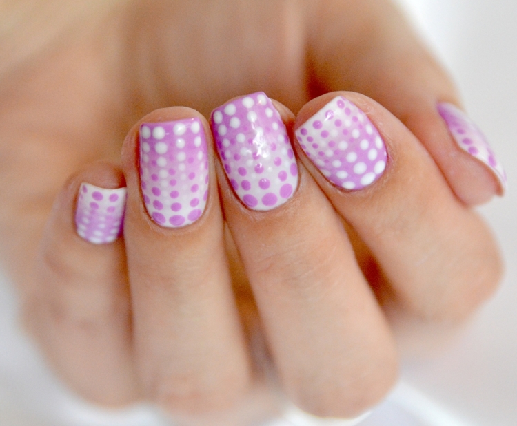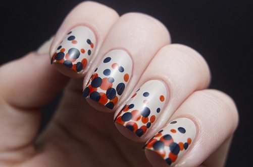- Ногти расписываются множеством точек, которые выполнены в одном оттенке, но вот переход цвета переходит по вертикали ногтевой пластины.