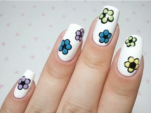Лепестки цветов очень просто нанести дотсом, после чего украсить дополнительным декором, стразами и сделать сердцевину другим цветом. Продолговатые лепестки удлиняют при помощи кисточек или обычной зубочистки, которая позволяет получить привлекательные «запятые».