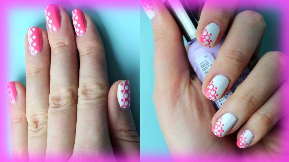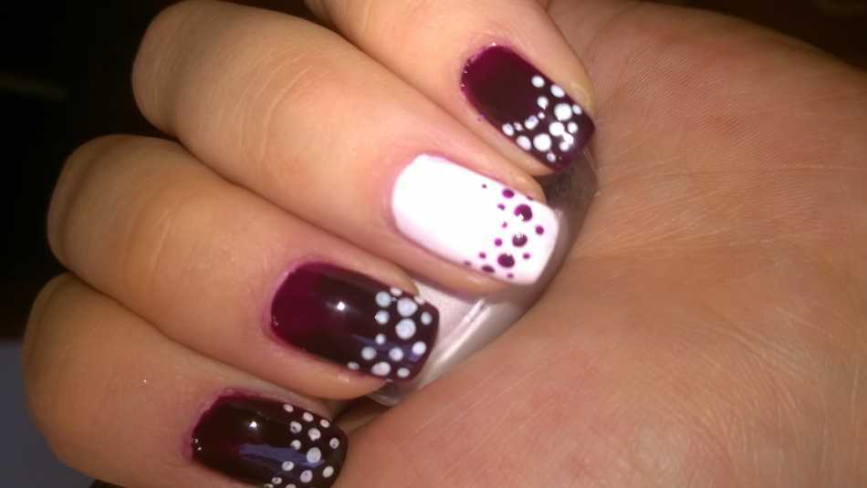 Но нужно иметь в виду, что самодостаточный сам по себе стиль ноготков «дотс» сочетается с градиентной основой несколько иначе. Вариантов для такого совмещения существует несколько: