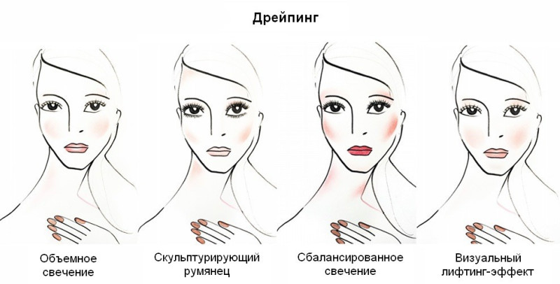 Это одна из разновидностей техник скульптурирования лица. Главными инструментами дрейпинга являются румяна различных оттенков (темные и светлые вариации), а также хайлайтер. Скошенной кисточкой из натурального ворса на область скул (от уха, и примерно до середины щеки) наносится темный тон. Светлые – в обратном направлении, от щечек к вискам, на так званые «яблочки».