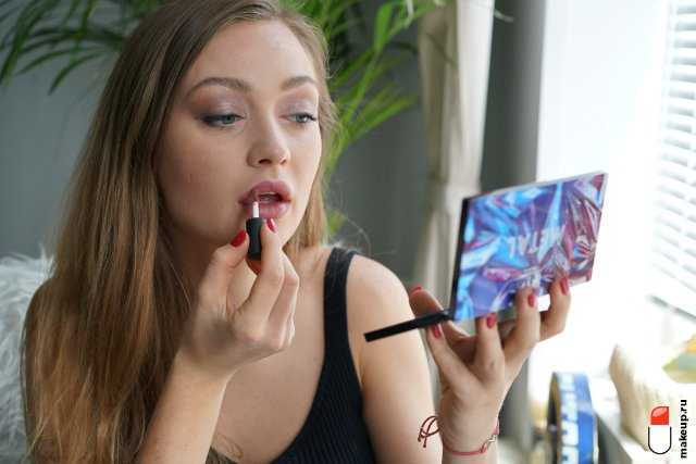 Губы накрасьте матовой кремовой помадой, поверх которой распределите немного румян.