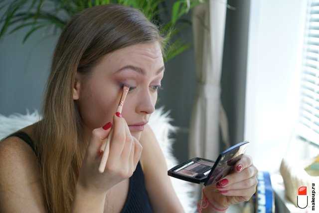 Чтобы добавить выразительности глазам, нанесите графитовый оттенок на нижнюю и верхнюю границы внутреннего уголка глаза и прокрасьте темно-сливовым оттенком верхний ресничный контур.