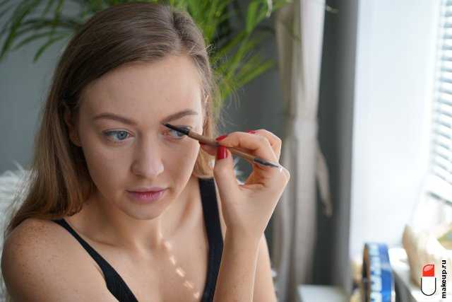 Если вы планируете использовать тушь и тени для глаз, обязательно подчеркните брови, иначе они «пропадут» на общем фоне. Отрывистыми движениями заполните пробелы там, где не хватает волосков, с помощью карандаша, как на фото ниже.
