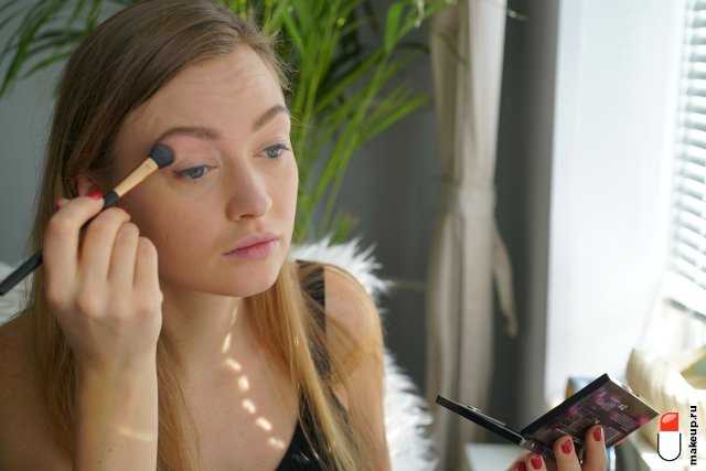 Распределите ее по лицу с помощью большой пушистой кисти, особое внимание уделяя области под глазами.. 4