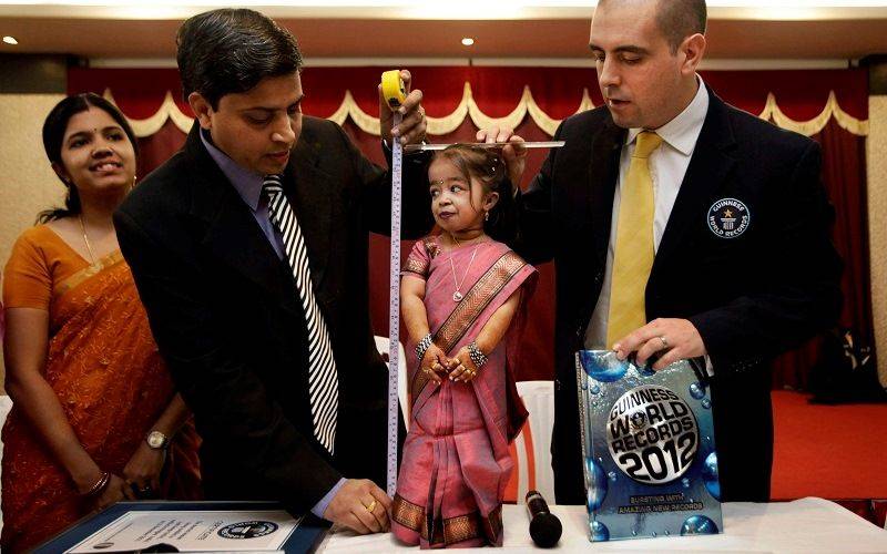 Жительница индийского города Нагпур прославилась на весь мир благодаря своим миниатюрным размерам. В возрасте 18-лет Джоти имела рост всего 62, 8 см. Рост девушки-карлика соответствует росту обычного двухлетнего ребенка.
