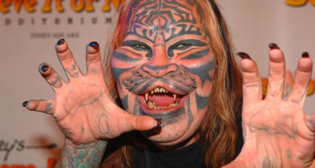Вы больше похожи на кошку или на собаку? Деннис Авнер, безусловно, походил на кота. Коренной американский индеец, также известный под именем Преследующий Кот, был до крайности верен своему тотемному животному — тигру. Тело Авнера было покрыто многочисленными татуировками, пирсингом, имплантатами, позволявшими ему носить «кошачьи» усы или изменившими форму его лица. Форма его ушей и глаз тоже была изменена хирургическим путём, а зубы были заострены — на что не пойдёшь ради любви к котикам.