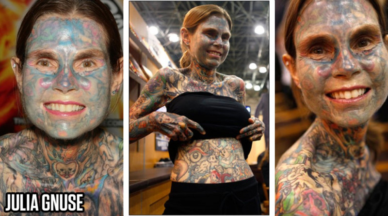 Американка прославилась на весь мир благодаря своему необычному внешнему виду. Стройное тело этой одной из самых удивительных девушек мира на 95% покрыто разного рода татуировками. По этой причине Джулия, больше известная под прозвищем «The Illustrated Lady», что в переводе обозначает «расписная леди», признана рекордсменкой Книги рекордов Гиннеса.