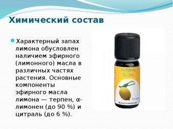 В маслах, изготовленных методом холодного прессования или даже посредством ручного отжима, содержится много компонентов, которые положительно влияют на здоровье. Также такая особенность химического состава способствует тому, что эфирное масло лимона используется не только в кулинарных, но и в косметических целях.