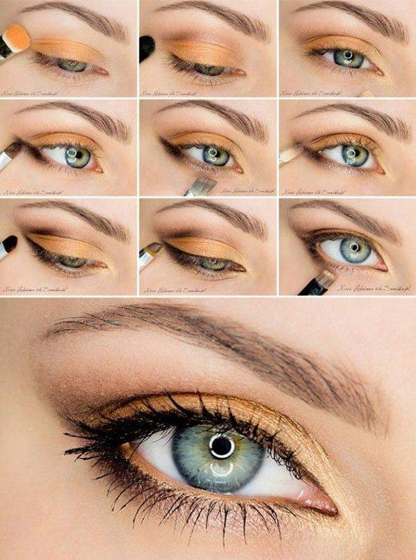 Мы советуем уделить особое внимание золотистым и шоколадным цветам. Нужно нанести базовый слой теней светло-желтого или золотого цвета, покрывайте только подвижное веко;