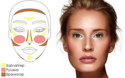 Для этого наносим бронзатор на зоны лица, которые мы хотим уменьшить или заметно сузить, а хайлатором выделяем область, которую хотим выделить. На щечки наносим натуральный оттенок румян. Все средства стоит тщательно растушевывать.