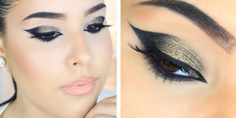 - После бровей женщине следует перейти непосредственно к глазам. Как правило, здесь работают два приёма – нанесение туши на ресницы для того, чтобы они были более объёмные и пушистые, а также подводка кожи век, как для верхнего, так и для нижнего, нередко с нанесением стрелок для формирования лисьего взгляда. Для тех, кому не хватает просто стрелки, можно воспользоваться тенями и выделить верхнее веко целиком.