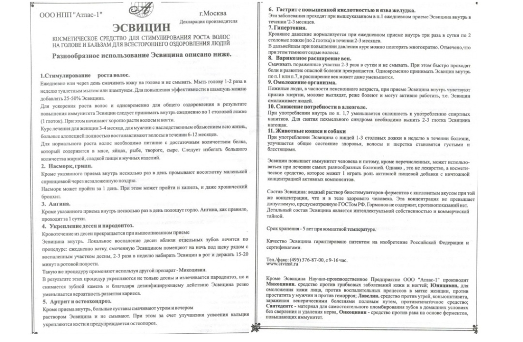 Инструкция к Эсвицин сообщает, что для достижения максимального эффекта, косметическим средством нужно не только обрабатывать корни волос, но и принимать во внутрь по 1 ст.л.