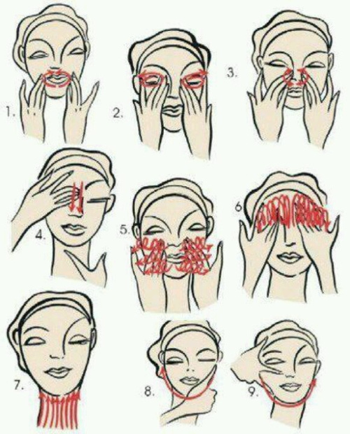 - участки вокруг глаз: на веке от переносицы к уголкам глаз, под глазами – в обратную сторону обеими руками одновременно;