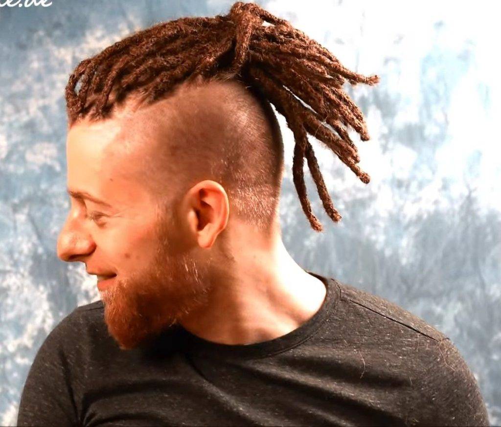 Mohawk с дредами. Сбритая височная и затылочная часть в сочетании с dreadlocks средней длины на темени выглядит очень эффектно. Такую прическу можно забрать в хвост или пучок, уложить в «птичье гнездо», поставить шипами.