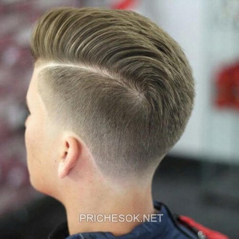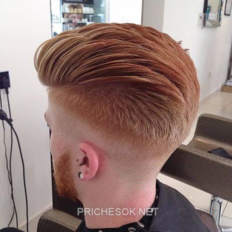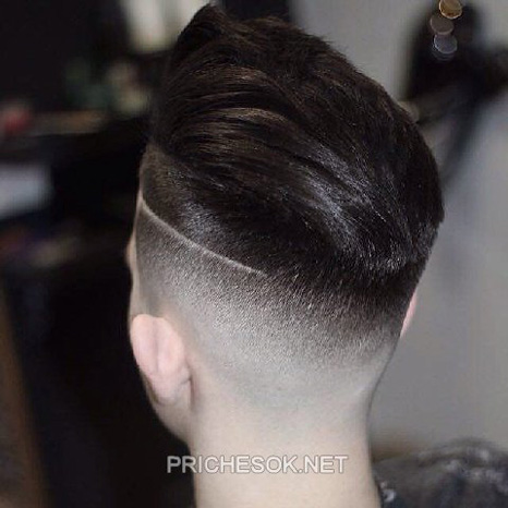 чаще всего выполняют с точной линией бокового пробора (Pompadur, Bald, Skin Fade Comb Over). Как и все «фейды» по линии перехода подразделяется на высокий, средний, низкий.