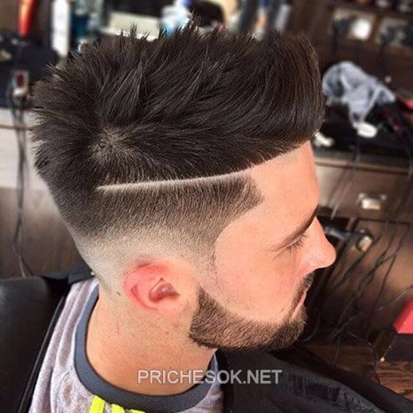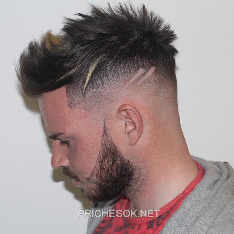 одним из вариантов Фейда может стать ирокез различной длины, а переход на височной зоне часто украшается четко выбритым фигурным контуром. Ирокез обычно выполняется не жестким панковым, а мягким с аккуратно ниспадающими прядями;
