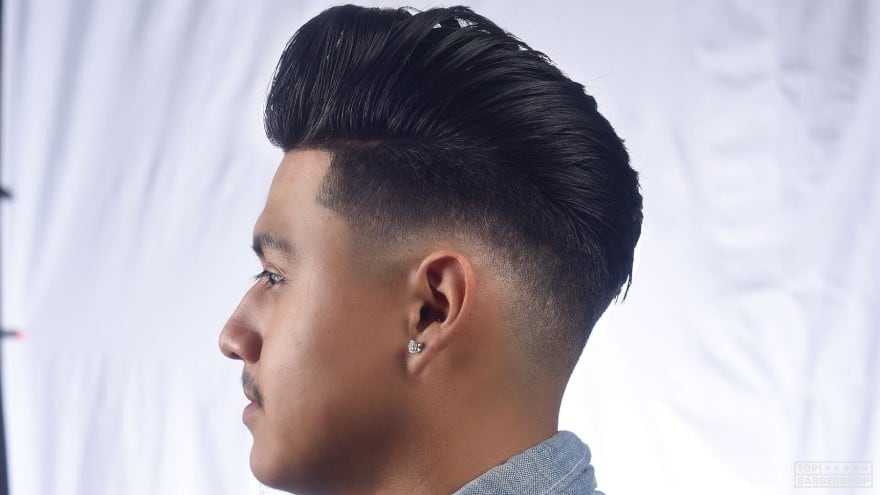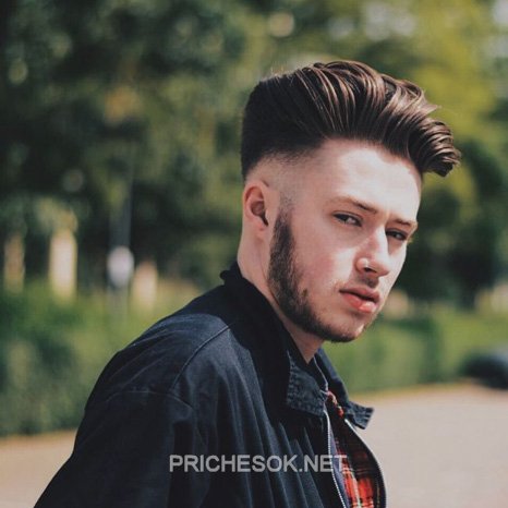Особенно популярной является прическа Помпадур с эффектом fade на затылке, со стильной челкой Элвиса на макушке.  |