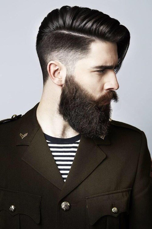 Плотная широкая волна помпадур резко сходит на нет почти у самой шеи. Борода по типу “подбородочный ремень” (Chinstrap) придает образу мужественности.  |