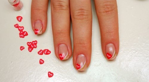 Композиции формируются за счет тонко нарезанных элементов. Чтобы частички были надежно закреплены, сверху них наносится не один, а несколько слоев прозрачного геля. А в связи с тем, что фимо очень мелкий материал, им можно как угодно обыгрывать и обратный френч, и французский маникюр.