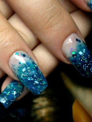 Самые популярные украшения для аквариумного маникюра – стразы и блески. Разные размеры этих элементов могут по-разному смотреться на ноготках различной длины. Для коротких натуральных ногтей лучше выбирать стразы небольшого размера, на искусственных покрытиях возможны более смелые эксперименты с величиной страз.