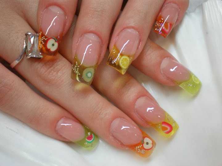 Среди украшений из акрила можно встретить разную тематику: ломтики фруктов, цветы, овощи, ракушки, аксессуары и пр. Использовать такой декор стоит также тематически и не смешивать их между собой. Для колорита окрашивают кончик ногтя в цвет, соответствующий тематике. К примеру, морской маникюр с ракушками можно обыграть, окрасив кончик ногтя в бирюзовый или голубой цвет.