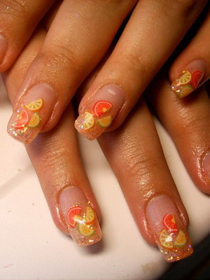 Самая интересная часть — создание шедевра. Пластинки фимо можно расположить на кончиках всех ногтей, создав фруктовое ассорти. Изображения половинок цитрусовых будут хорошо смотреться в лунном маникюре (на основании ногтя).