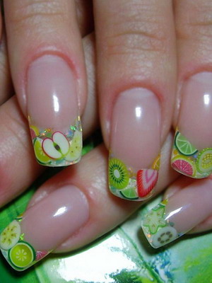 Некоторые идеи того, как выполнить маникюр с фимо, представлены на видео и фото в данном материале. Наиболее популярным принтом фимо являются фрукты. Ими могут оформляться только кончики ногтей, создавая некоторое подобие французского маникюра. Особый интерес данный дизайн вызывает ещё и потому, что «фруктовые» принты можно нарезать тем или иным образом. Это не только упрощает их размещение на ногте, но и придаёт оформлению интересные нюансы.