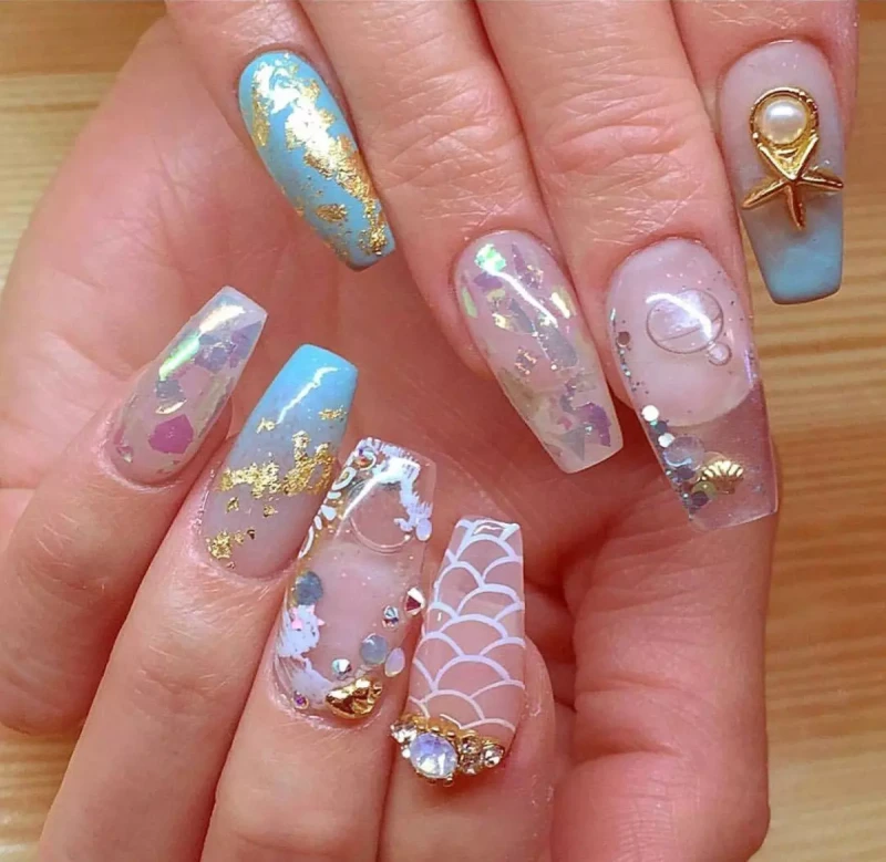 В виде ракушек, морских звезд чаще можно встретить акриловую лепку: из акрила удобно создавать такие элементы небольшого размера, чтобы было удобно применять в дизайне. Натуральный материал можно применять в виде ракушечной крошки или небольших экземпляров, которые можно найти на любом морском побережье. Использовать такой декор рекомендуемо на искусственных ногтях.