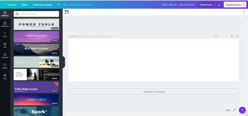Выбрав шаблон, вы получаете пустой холст нужных размеров, на котором вам предстоит сотворить дизайн своей мечты.