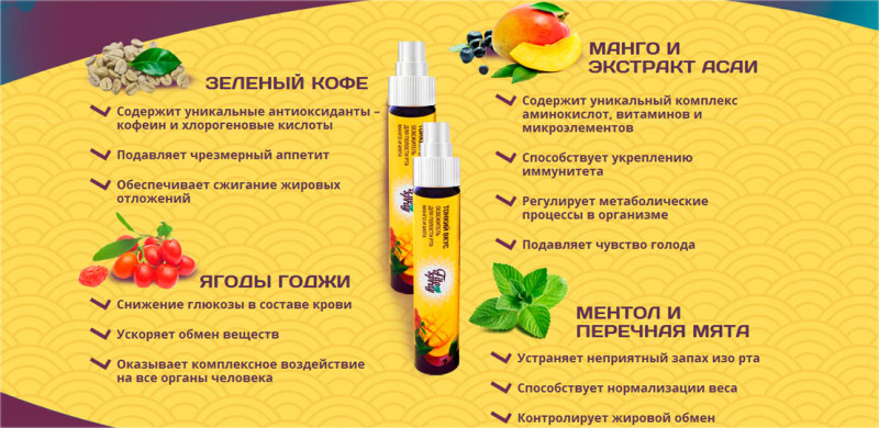 Многие девушки, пытаясь похудеть, используют в этой нелегкой борьбе многочисленные, проверенные временем, способы. Тренажеры, сауны, обертывания, различные салонные процедуры, таблетки, народные средства — все варианты хороши, но что выбрать? В последнее время на рынке появился фито спрей, который заинтриговал потребителя простотой в использовании и полученным результатом. Отзывы врачей относительно этого препарата различны. Однако оценивая его состав, они согласны с действием его компонентов. В состав препарата входят многочисленные вещества, такие как ягоды годжи, лимонная кислота, зеленый кофе и многие другие, которые в совокупности помогают:.