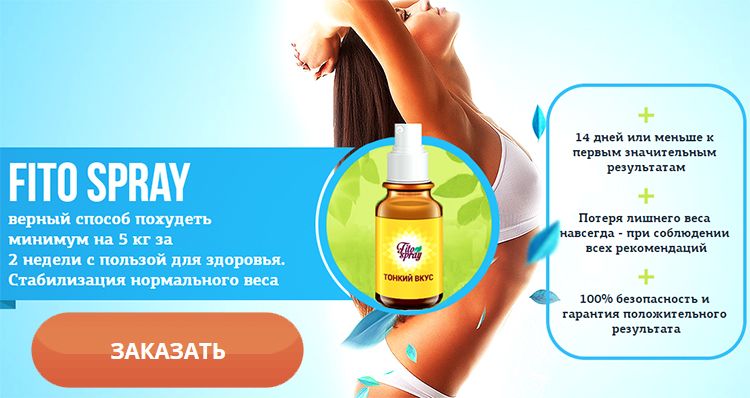 Уже проверенное средство на рынке, FitoSpray является продуктом, который прост в применении и позволяет быстро избавиться от лишних килограммов. Он представлен в формате спрея – распыляйте жидкость в полость рта перед приемом пищи для устранения голода. Также продукт освежает, придает бодрости, способствует похудению. Фитоспрей производится на территории России, рекламируется известным тренером Татьяной Тарасовой.