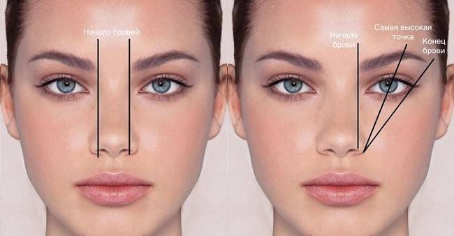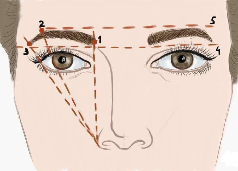 - Конец брови расположен там, где пересекается с надбровной дугой предмет, приставленный к крылу носа и проходящий через внешний край глаза. На этом месте следует поставить метку.
