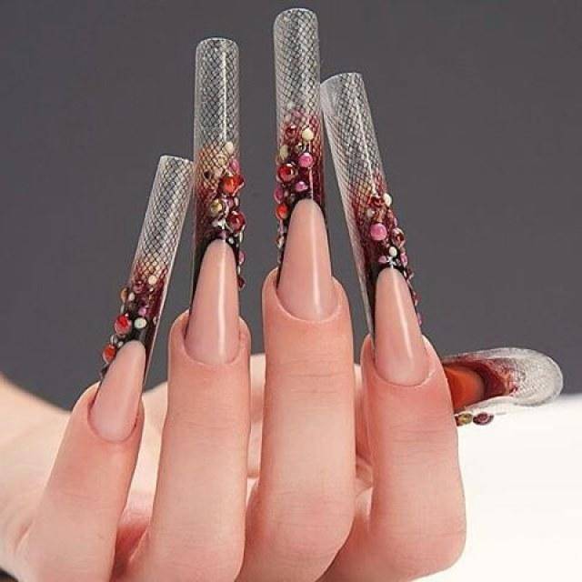 Поскольку удивительная прочность ногтевой пластины позволяет регулировать длину, на такой обширной площади можно создать настоящие шедевры нейл-арта. Для этого применяют кружево, кусочки ткани, разноцветные комбинации, необычные узоры, полудрагоценные камни и прочие элементы декора. «Пайп» зачастую выбирают невесты, поскольку высокая прочность и эстетическая привлекательность делают форму идеальным вариантом на свадьбу. Оцените всю красоту нарощенных ногтей, взглянув на нашу коллекцию фото, которая содержит различные варианты нейл-арта.