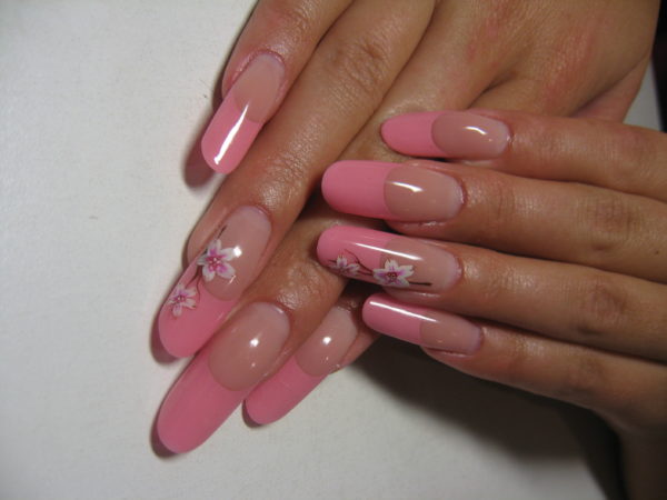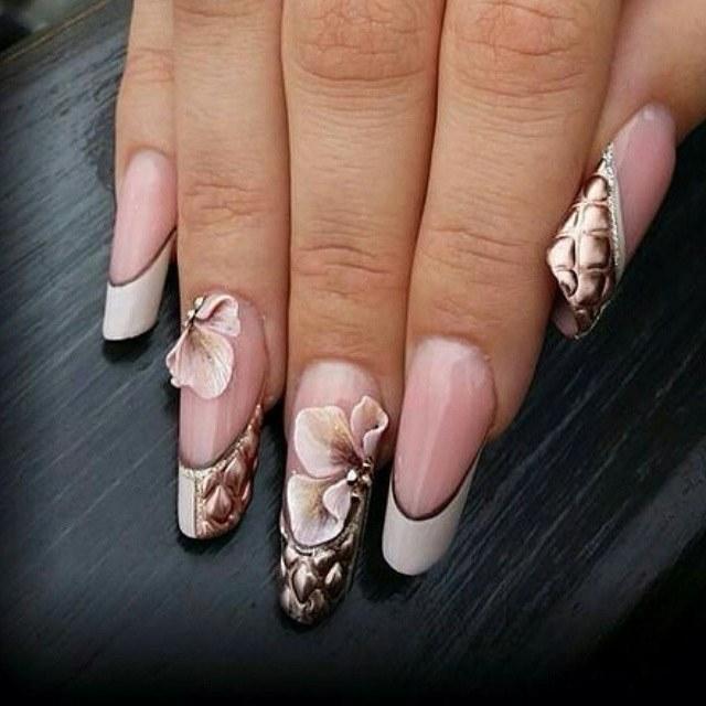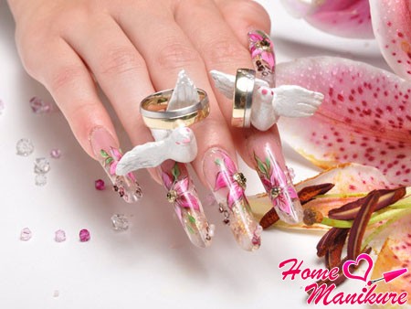 Очень красивой на таких ногтях получается роспись любого вида. Будь то цветы в китайском стиле или ультрасовременные абстракции выходит удивительно. Готовясь к свадьбе большинство невест выбирают именно эту форму