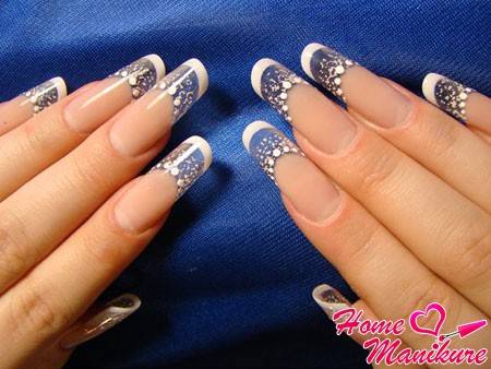 Настоящим трендом в последних сезонах стал «хрустальный» френч. Это интересный дизайн ногтей, где свободный край остается прозрачным, к нему лишь добавляется немного блеска, чтобы полностью имитировать хрусталь. Такое наращивание идеально для свадебного торжества. Смотрится «хрусталь» очень нежно и «воздушно».