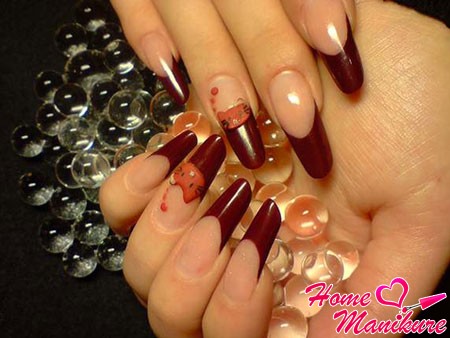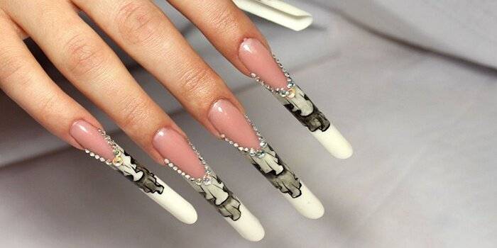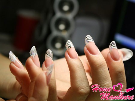 Декорировать можно стразами, художественной лепкой, рисунком и трафаретом, но особенно интересно и стильно такая форма ногтей смотрится с френчем.