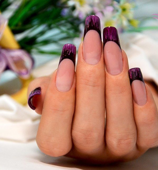 Пейп маникюр позволяет делать классический френч, а также цветной или блестящей миллениум френч, нестандартный, перевернутый или голливудский вариант маникюра.
