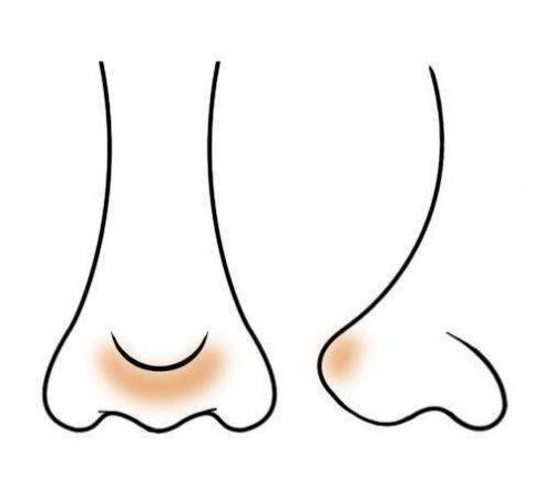 Если вам не нравится вздернутый кончик носа, нанесите темный корректор так, как показано на схеме ниже. Это поможет визуально его «опустить».