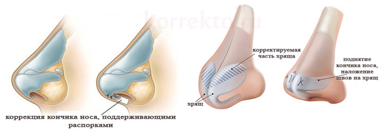 Коррекция кончика носа. После восстановления носовой перегородки и ремоделирования спинки носа переходят к коррекции кончика носа за счёт изменения формирующих его хрящей и мягких тканей. По окончании операции нос тампонируется марлевыми тампонами или турундами, которые удаляются через 1-3 дня, когда сочтёт возможным врач. На нос накладывается гипсовая повязка, которая снимается через неделю.