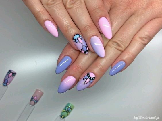 «миндаль» и «балерину» дополнят пастельные цвета и металлик. На такие виды ногтей стоит наносить лак, начиная с середины, а кончики прокрашивать в последнюю очередь;