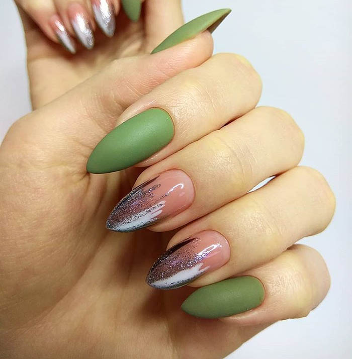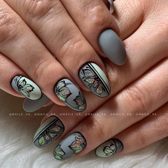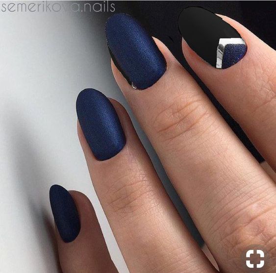 Матовый маникюр на овальных ногтях с гель лаком металлик.
