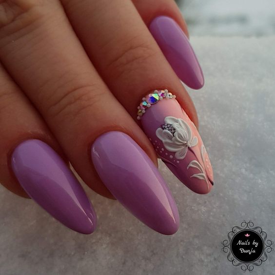 Эта форма для маникюра отличается тем, что в ней абсолютно отсутствуют какие-либо углы. От линии роста ноготок достаточно плавно стремится к центру и аккуратно закругляется на кончике. Миндаль подойдет лишь тем барышням, которые обладают изящными длинными пальчиками и узкими ногтевыми пластинами. При этом следует отметить, что длина ногтевого ложа должна быть не особо большой, ведь кончик миндалевидного ноготка должен быть существенно длиннее ногтевого ложа. В том случае, если «миндаль» будет чересчур длинным, он будет смотреться неестественно, может загибаться в разные стороны или просто сломаться.