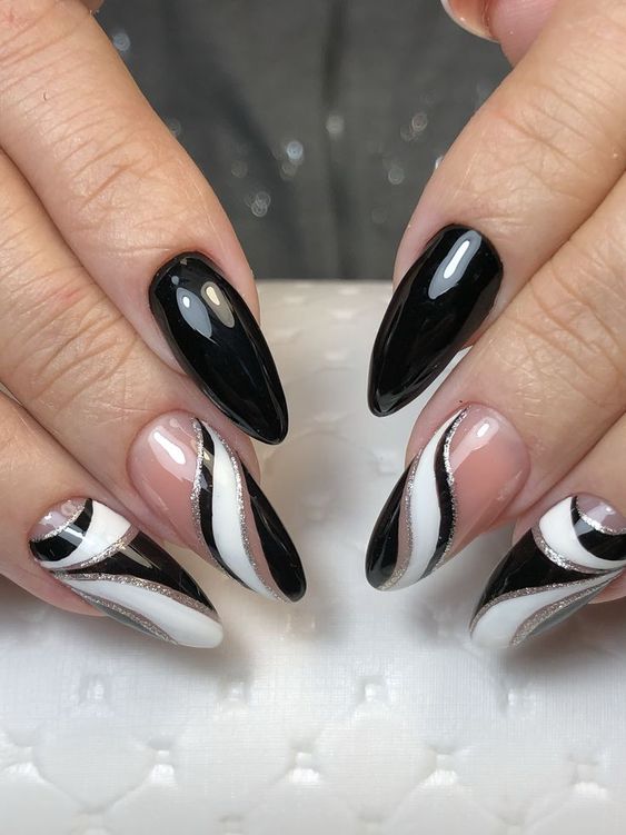 - Color black. Модная техника, суть которой заключается в разделении ноготков на секторы. Каждая часть оформляется разными цветами. В результате выходит яркий, нарядный маникюр с необычными линиями. Делить можно как черными полосами, так и блестящими.